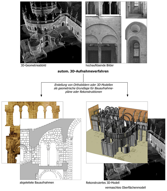 Für eine möglichst vollständige 3D-Erfassung kommen in Archäologie und Bauforschung häufig bereits automatische 3D-Aufnahmeverfahren, wie Laserscanning, Streifenlichtscanning oder automatische Stereobildauswertung zum Einsatz. Charakteristisch für diese Verfahren ist eine weitgehend automatisierte Erfassung des Objektes durch direkte oder indirekte Abtastung der Objektoberfläche mit einer sehr hohen Auflösung und Genauigkeit in sehr kurzer Zeit. Im Gegensatz zu den klassischen Aufnahmeverfahren entsteht eine sehr dichte Wolke aus 3D-Punkten, welche die Objektoberfläche "vollständig" abbildet. Das Messergebnis ist damit einerseits weitgehend unabhängig vom "Beobachter" und seiner persönlichen Wahrnehmung bzw. Interpretation des Objektes, zum anderen ist die Messung aber auch unabhängig von der späteren Auswertung bzw. Fragestellung und kann neben der Bauforschung ebenso für Restaurierung, Rekonstruktion, Statik etc. verwendet werden.